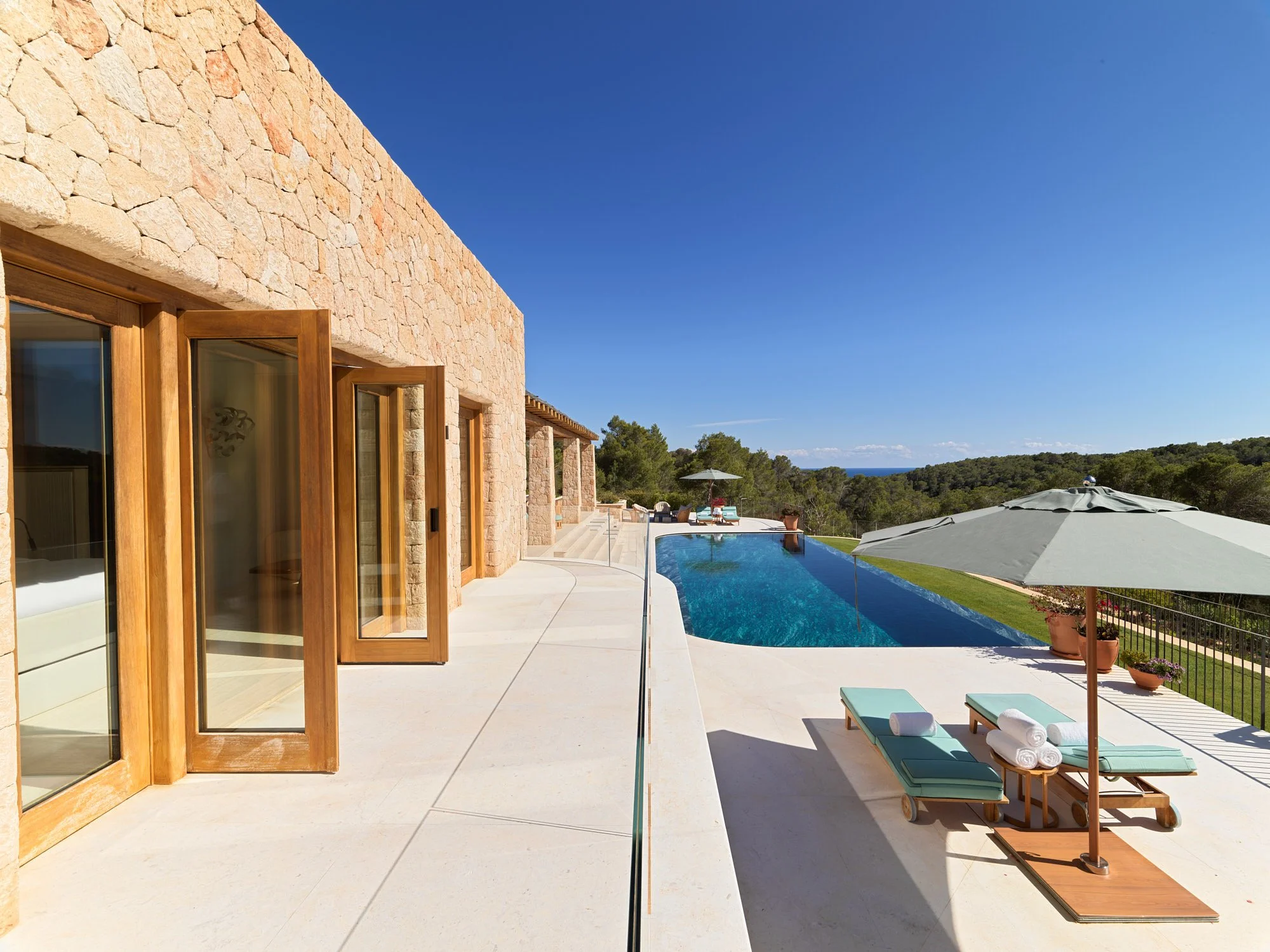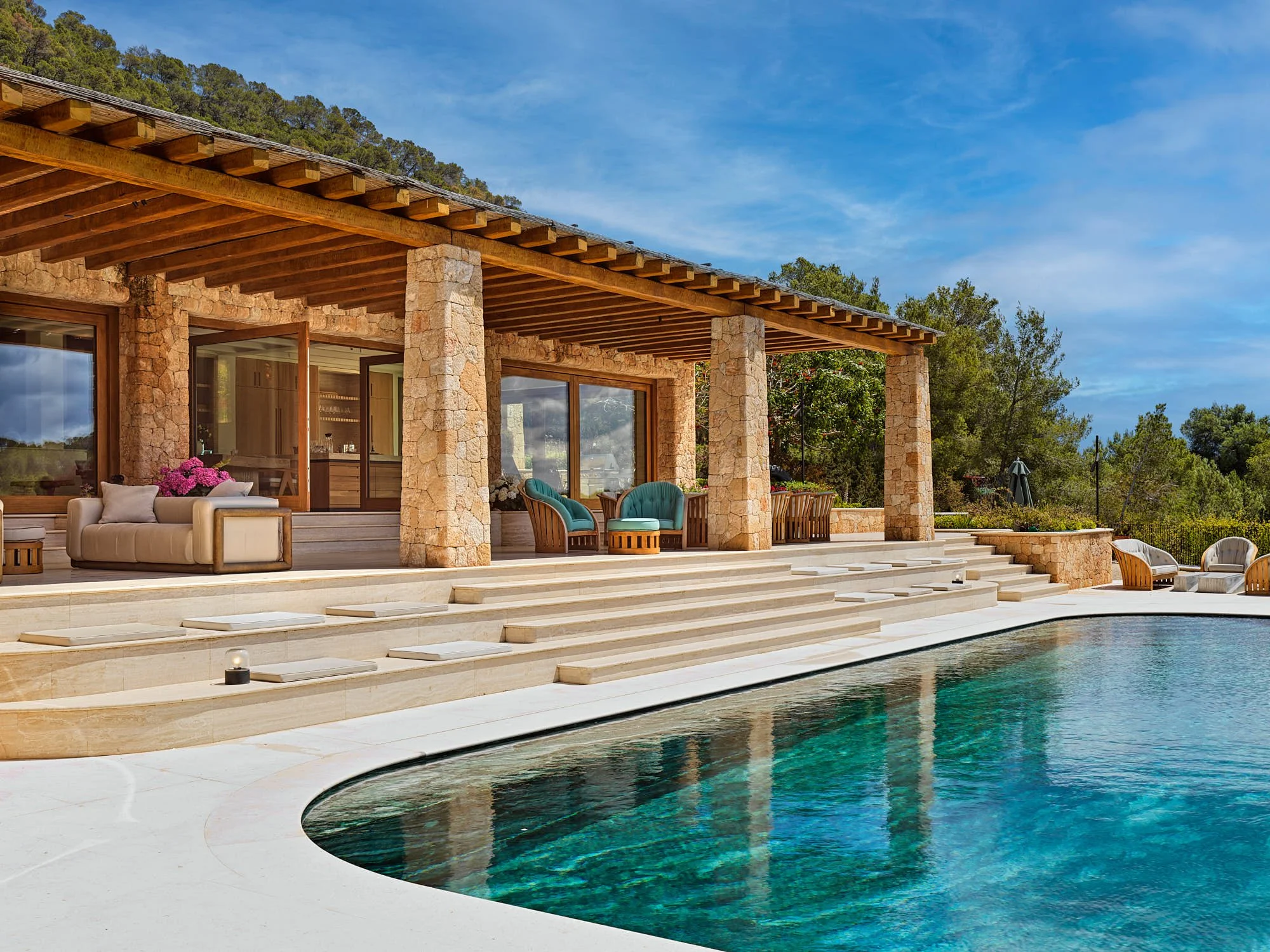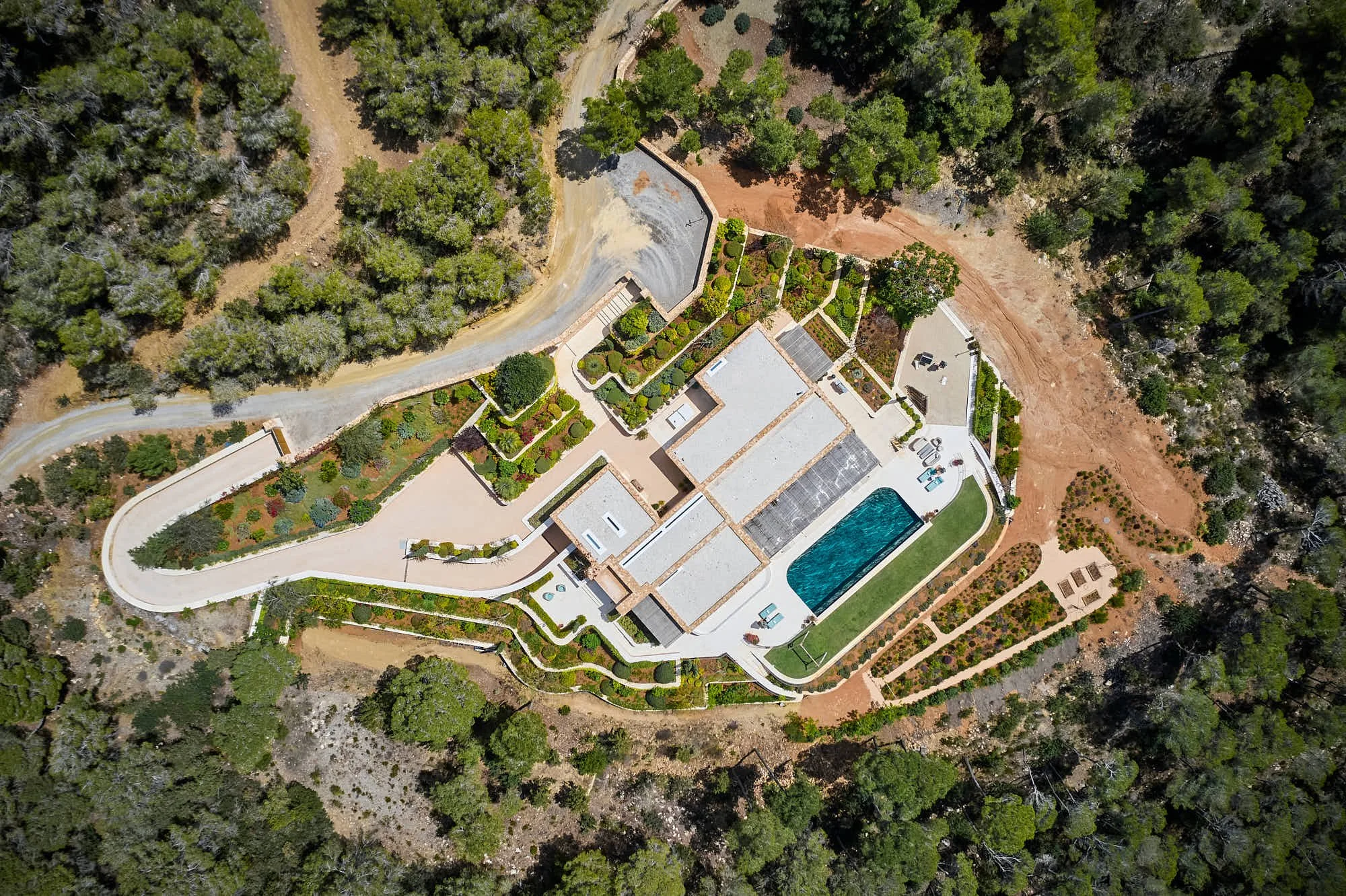 Perched on an 85,000 sqm hilltop plot in northeast Ibiza near San Carlos, Can Brut overlooks the Balearic Sea and ancient sabina juniper forests, blending modern design with island traditions. Designed by Framework Studio, the villa features local stonework, travertine floors, and Verde Lamponia pool edges that echo rural Ibizan cultivation.