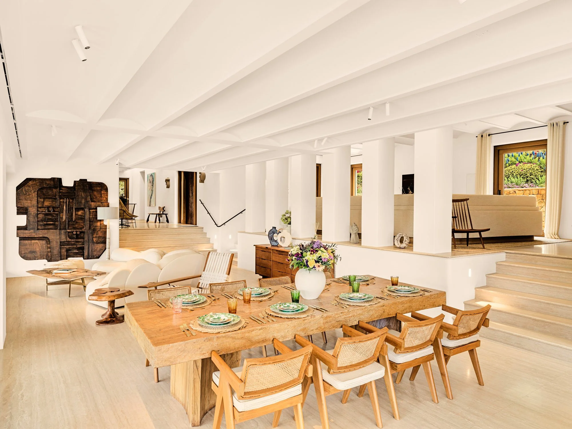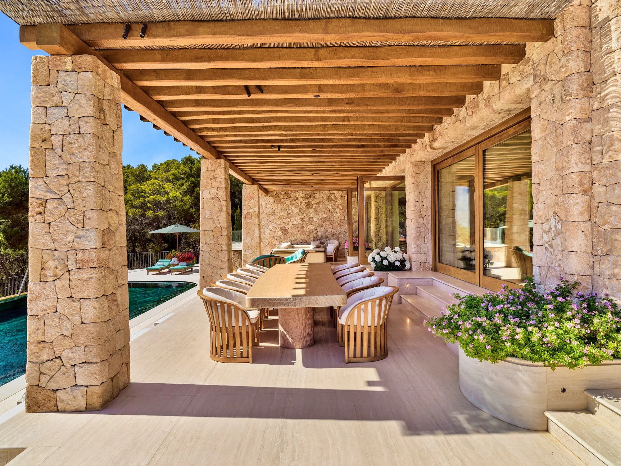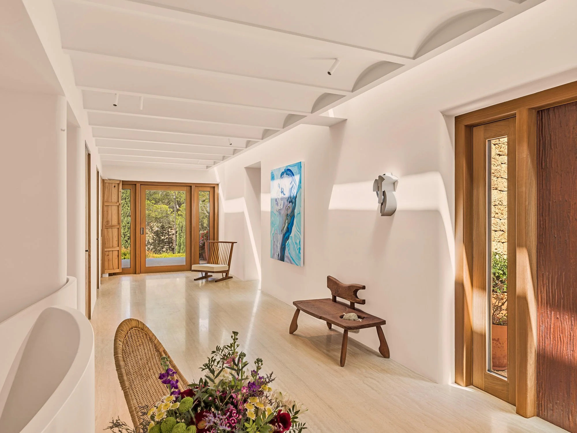 Perched on an 85,000 sqm hilltop plot in northeast Ibiza near San Carlos, Can Brut overlooks the Balearic Sea and ancient sabina juniper forests, blending modern design with island traditions. Designed by Framework Studio, the villa features local stonework, travertine floors, and Verde Lamponia pool edges that echo rural Ibizan cultivation.