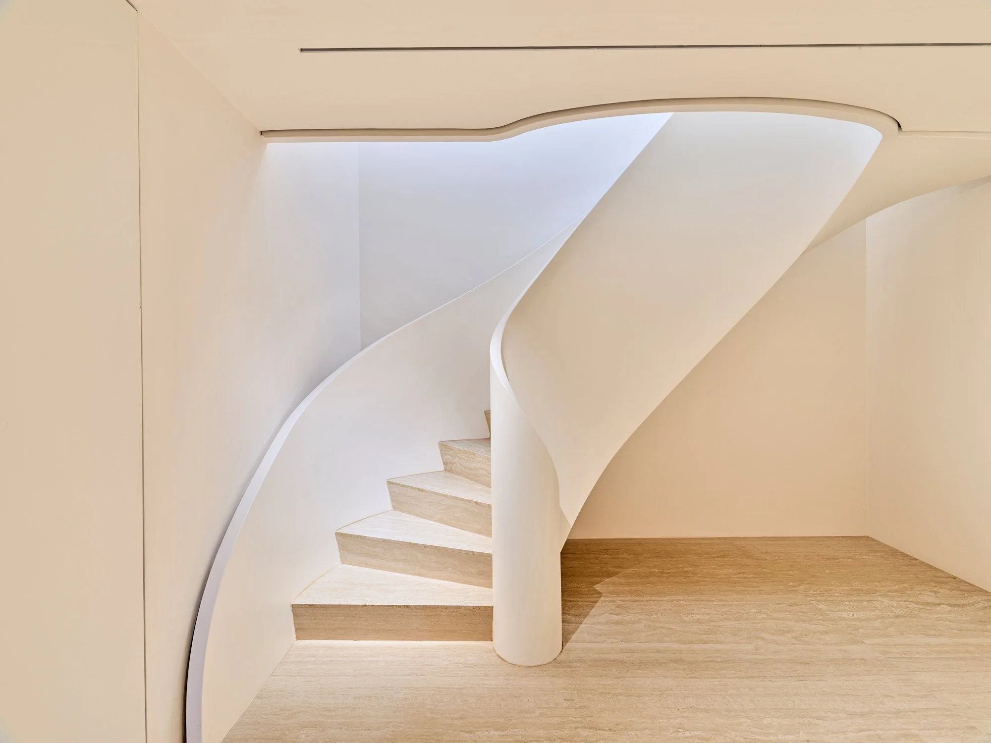 Entry via a 1970s NP2 panel door by Italian artists Nerone and Patuzzi leads to matte plaster walls, bespoke doors reminiscent of George Nakashima, and panoramic terraces. Hydraulic pivoting windows, Crestron automation, Gaggenau appliances, and floor heating enhance its luxury craftsmanship.